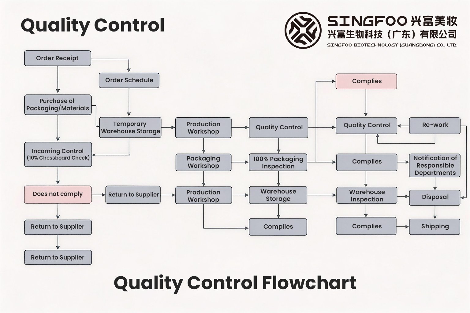 Our quality control process covers every stage: Order placement → Material procurement and shipping → On-site QC, 100% inspection → Rejection of defective materials → Warehousing of quality goods → Production → Rework or disposal of defective products → Packaging → 100% final inspection → Secondary sorting → Shipment of quality products.