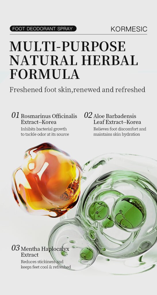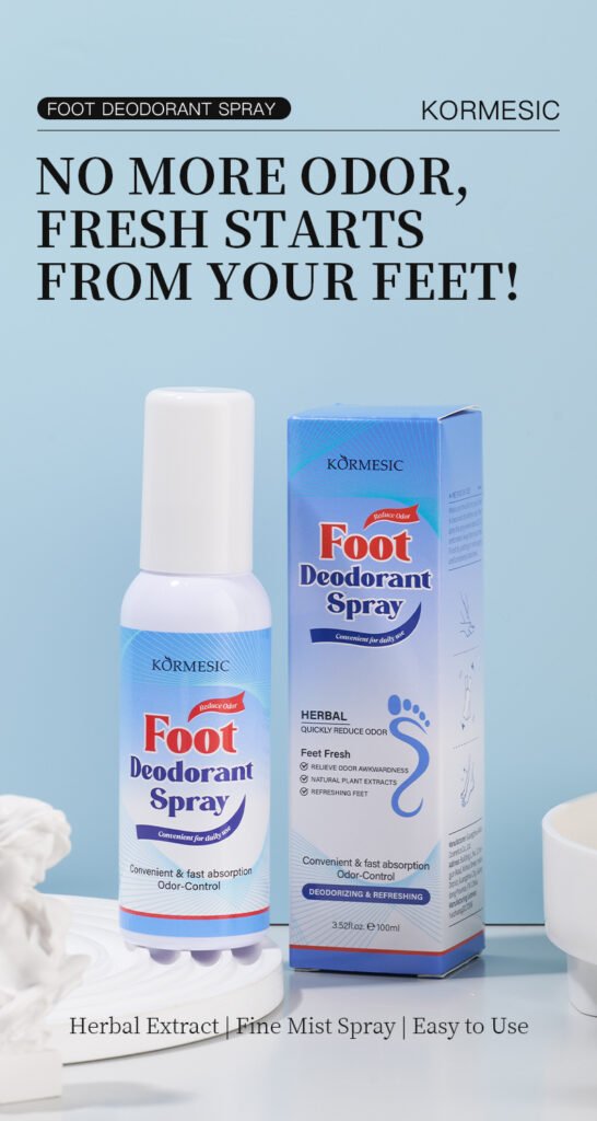 KORMESIC — Спрей для ног с растительными экстрактами освежает, контролирует потоотделение, подавляет запахи и снимает усталость, обеспечивая комфорт на весь день